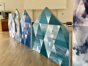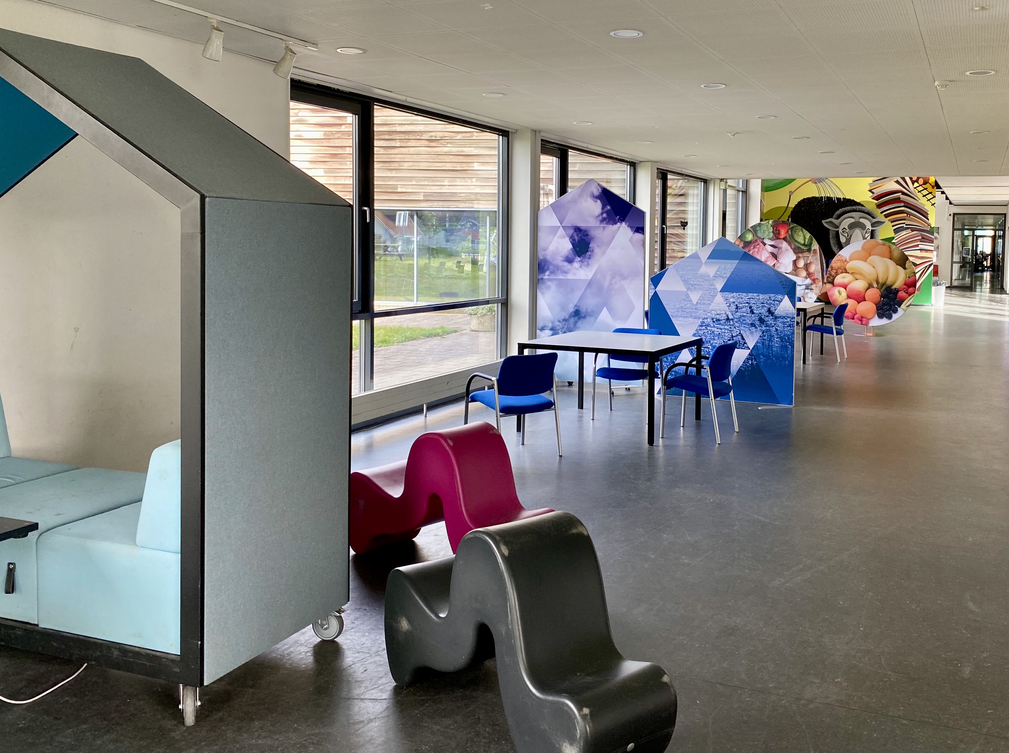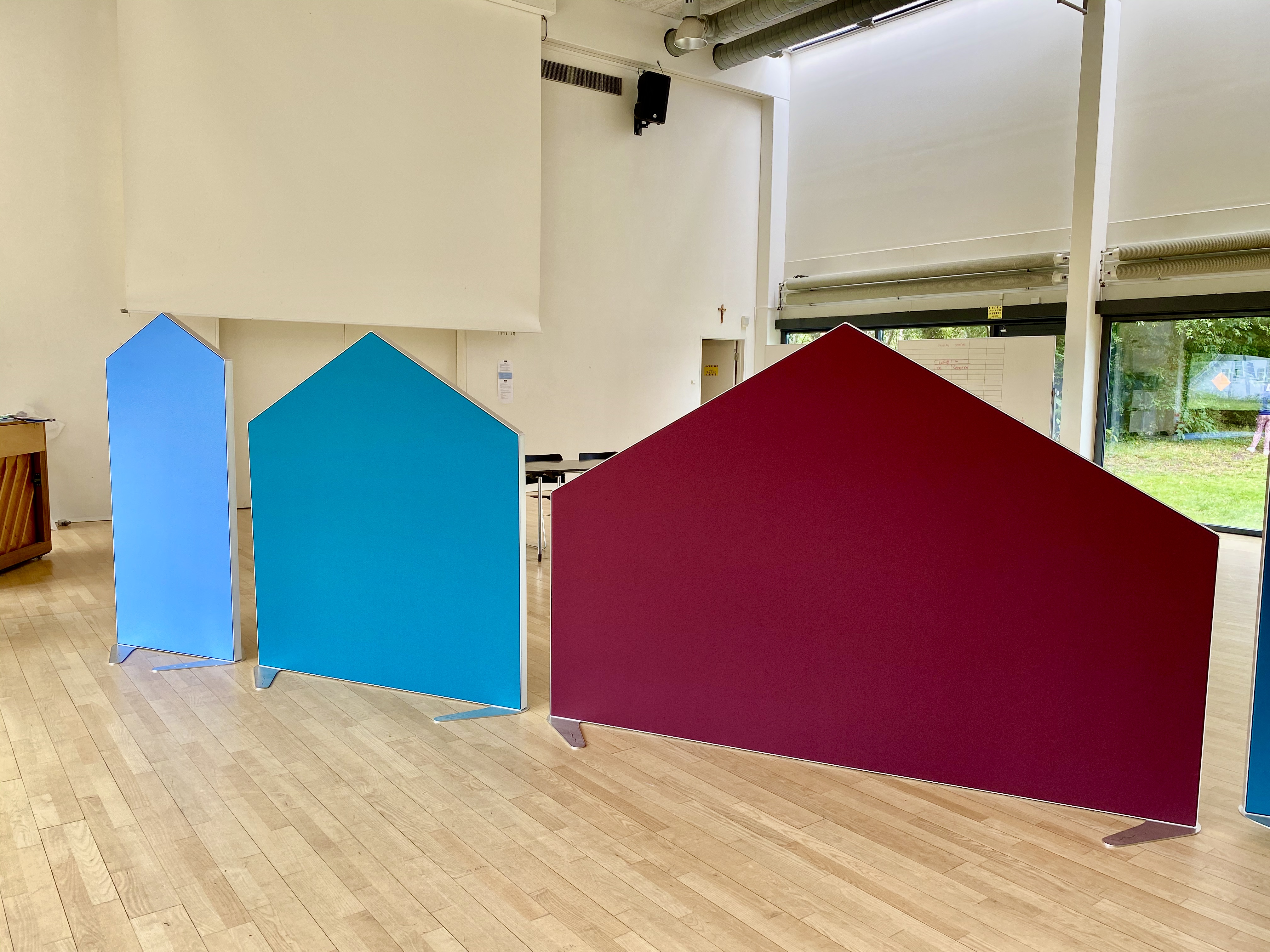 Ovenfor ses en skærmvæg som husgavl akustik. Med eloxeret alu ramme og grafik. Denne løsning kan anvendes som støjdæmpende opslagstavle.